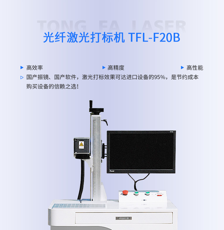 通發激光研發的TFL-F20B激光打標機,金屬材質和塑膠材質均可進行打標加工。本激光鐳雕機光纖激光器、振鏡、軟件、聚焦鏡等核心配件采用原裝進口,性能穩定,壽命是國產器件的1.5倍,是高端客戶的優選。